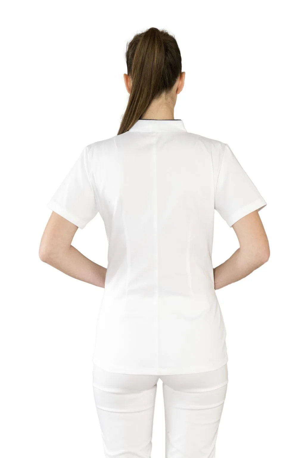 Ženska radna jakna model 0159 jedan je od najprodavanijih modela zahvaljujući elegantnom kroju i diskretnom dizajnu sa skrivenim kopčanjem na drikere. Ovaj model pruža izuzetno uredan i profesionalan izgled, bez vidljivih gumba, što ga čini savršenim izborom za suvremene medicinske i estetske centre.